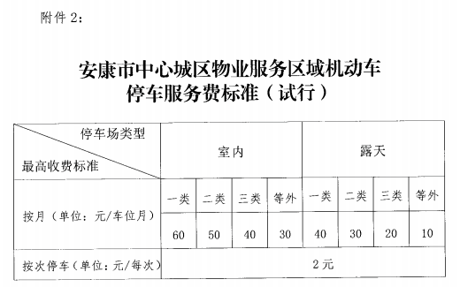 2、《安康市中心城區(qū)物業(yè)服務(wù)區(qū)域機(jī)動車停車服務(wù)費標(biāo)準(zhǔn)》(試行)。