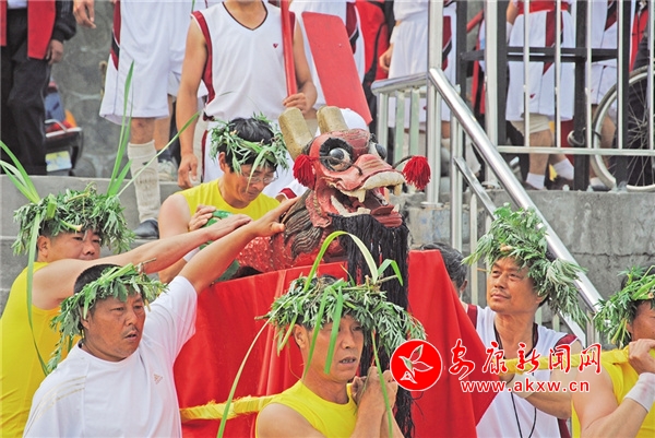 2010年6月13日,第十屆安康龍舟節(jié)開幕前一天,所有參賽船隊在西關土地廟迎接老黑龍至漢江邊,并舉行了龍舟開賽前的下水祭祀儀式。鄧軍 攝