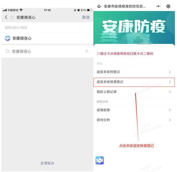 第一步,打開微信,搜索“安康微連心”小程序(首次登記需先實名認(rèn)證),點擊“安康防疫”,點擊“返安來安排查登記”。