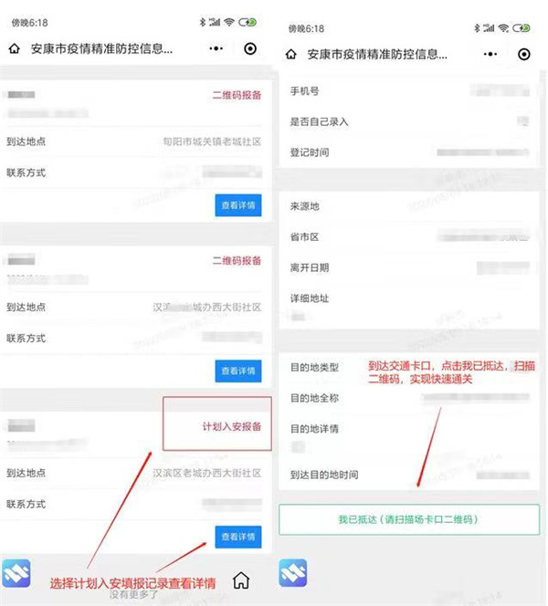 第三步,通過交通卡口,打開“安康微連心”微信小程序,點擊“安康防疫”,進入“我的上報記錄”,點擊“查看詳情”,點擊“我已抵達” 并掃描交通卡口“返安排查登記二維碼”確認(rèn)抵達。
