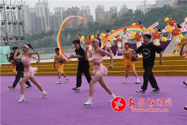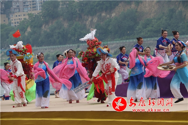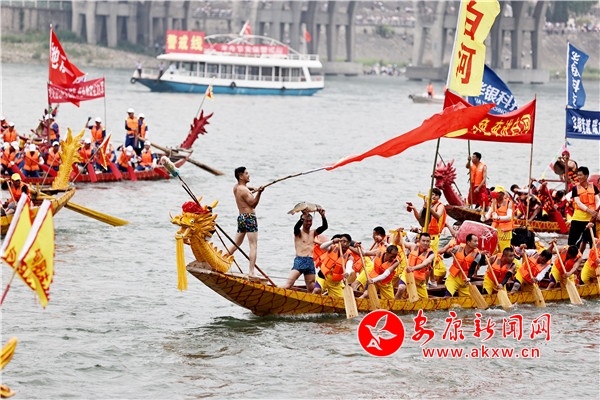 傳統(tǒng)儀式結(jié)束后,歌舞《打谷歡歌》、水岸表演《舞動漢江 活力安康》、民俗展演《向幸福出發(fā)》、新編漢劇《大美安康》、全新原創(chuàng)歌曲《端午最安康》相繼登臺,優(yōu)美的舞蹈配合婉轉(zhuǎn)唱腔,寓情于景,將傳統(tǒng)與現(xiàn)代、生活與藝術(shù)融合得恰到好處。期間還穿插進行了安康最富神采的經(jīng)典龍舟民俗項目——龍舟橫渡和搶鴨子、摸鯉魚。伴隨著震撼的鼓點聲,29支參賽龍舟隊伍的健兒們劈波斬浪,你追我趕,爭相抵達江岸。隨后,只見江面上水花飛濺,龍舟健兒們從龍舟上一躍而下,在湍急的江水中徒手捕捉浮游于江面的鴨子和鯉魚,勝利者將手中的魚兒與鴨子高高舉起,把富貴吉祥、安寧康泰的祝福送給大家。最后,第二十二屆中國安康漢江龍舟節(jié)主題活動在歌曲《hello 安康》喜悅的氛圍中圓滿落幕。