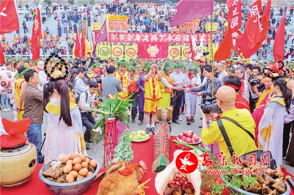 2014年,第十四屆安康龍舟節(jié)期間,人們在漢江龍舟苑舉行傳統(tǒng)祭祀儀式。 邵向東 攝