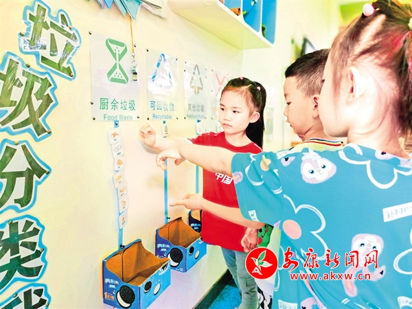 走進(jìn)漢濱區(qū)幼兒園,隨處可見以垃圾分類為主題的展板。該園老師鄭玉介紹:“全園15個班,每個班都設(shè)置有垃圾分類專題角,每學(xué)期不定期開展垃圾分類主題教育活動,每周一圍繞垃圾分類的意義、如何分類、處理辦法和注意事項(xiàng)等定期開展活動。并利用走廊設(shè)置垃圾分類專題區(qū),制作垃圾分類戶外展板,通過微信公眾號和交流群,以“小手拉大手的形式”,帶動家庭參與到垃圾分類行動中來。”