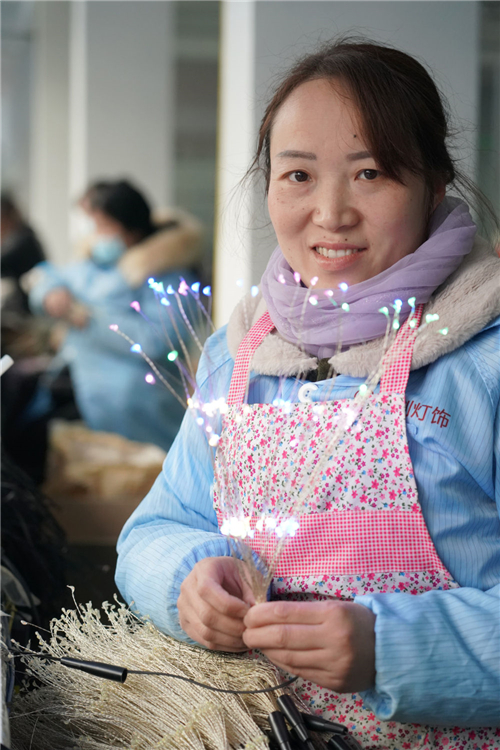 在安康市白河縣城關鎮(zhèn)安坪社區(qū)一家燈飾社區(qū)工廠內(nèi),工人馬友梅在展示制作的產(chǎn)品(2月22日攝)。新華社記者邵瑞攝