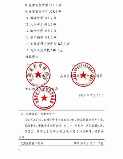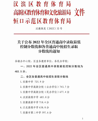 7月10日,漢濱區(qū)教育體育局、高新區(qū)教育體育和文化旅游局、恒口示范區(qū)教育體育局聯(lián)合印發(fā)文件,公布了2022年漢濱區(qū)普通高中錄取最低控制分?jǐn)?shù)線和各普通高中統(tǒng)招生錄取分?jǐn)?shù)線。