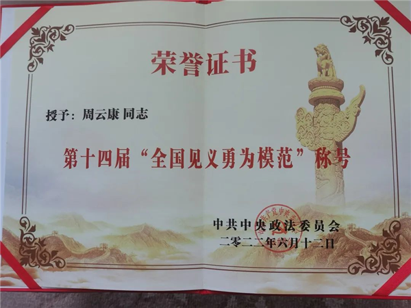 獲此殊榮,周云康感到十分激動,他說:“在人民群眾有生命危險時,見義勇為,挺身而出,是自己的本能,很榮幸能受到國家表彰,國家和人民給了自己這么高的榮譽,作為一名志愿者,今后將不忘初心,繼續(xù)傳遞見義勇為的正能量,帶動更多的人,積極主動投身見義勇為的行列之中,為平安安康做出貢獻。”