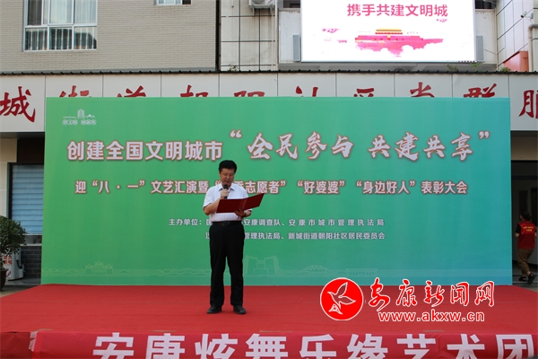 本網(wǎng)訊(通訊員 趙小玉 譚成鈴)為扎實(shí)推進(jìn)全國(guó)文明城市創(chuàng)建工作,營(yíng)造“全民參與,共建共享”的濃厚氛圍,進(jìn)一步掀起幫扶社區(qū)的創(chuàng)文工作熱潮,8月1日晚,國(guó)家統(tǒng)計(jì)局安康調(diào)查隊(duì)聯(lián)合市、區(qū)城市管理執(zhí)法局、朝陽(yáng)社區(qū)居委會(huì)共同舉辦了朝陽(yáng)社區(qū)“創(chuàng)建文明城市‘全民參與,共建共享’”迎“八一”文藝匯演暨“優(yōu)秀志愿者”“好婆婆”“身邊好人”表彰活動(dòng)。市人大常委會(huì)黨組成員、副主任趙立根出席活動(dòng)并講話。