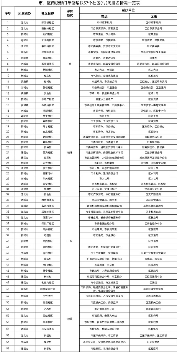 附:市、區(qū)兩級部門單位幫扶57個社區(qū)(村)周排名情況一覽表