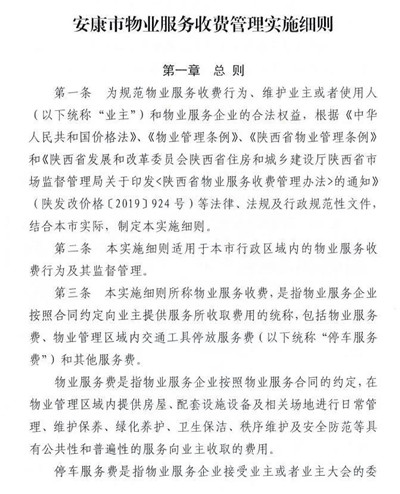 為貫徹落實《陜西省物業(yè)服務(wù)收費管理辦法》,進一步加強我市物業(yè)服務(wù)收費管理,規(guī)范物業(yè)服務(wù)收費行為,維護業(yè)主和物業(yè)服務(wù)企業(yè)的合法權(quán)益,促進物業(yè)服務(wù)行業(yè)健康發(fā)展。依據(jù)《中華人民共和國民法典》、《中華人民共和國價格法》、《陜西省物業(yè)管理條例》、《陜西省定價目錄》及《陜西省物業(yè)服務(wù)收費管理辦法》等法律法規(guī), 結(jié)合我市實際,我們制定了《安康市物業(yè)服務(wù)收費管理實施細則》及中心城區(qū)物業(yè)服務(wù)收費政府指導價標準,經(jīng)市政府同意,現(xiàn)印發(fā)給你們,請遵照執(zhí)行。各縣(市、區(qū))發(fā)改部門應(yīng)會同相關(guān)部門盡快制定符合各地實際的前期物業(yè)服務(wù)收費政府指導價標準。