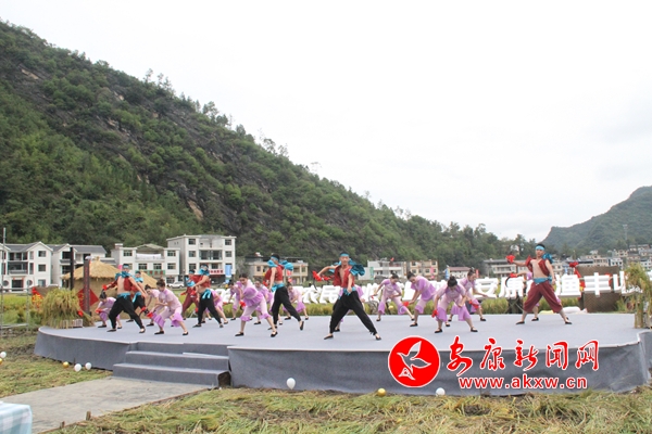 在純凈的背景下,舞蹈《歡天喜地慶秋收》、歌伴舞《開(kāi)缸酒》、漁鼓道情《生態(tài)旅游興旬陽(yáng)》、小品《電商助農(nóng)促豐收》、表演唱《群雁回歸興鄉(xiāng)村》、《咱老百姓》、歌舞《追夢(mèng)綠色向未來(lái)》等節(jié)目精彩上演, 獨(dú)特的舞臺(tái)形式將豐收盛景定格在畫卷中,舞者起舞慶豐收,舞出了農(nóng)人心中的喜悅,傳遞著農(nóng)人豐收的幸福。
