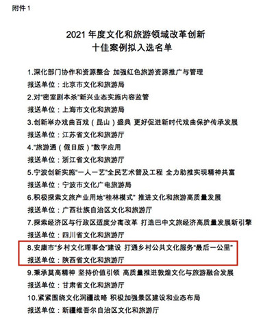 本網(wǎng)訊 近日,文化和旅游部發(fā)布《關(guān)于2021年度文化和旅游領(lǐng)域改革創(chuàng)新十佳案例、優(yōu)秀案例名單的公示》,《安康市“鄉(xiāng)村文化理事會”建設(shè) 打通鄉(xiāng)村公共文化服務(wù)“最后一公里”》上榜2021年度文化和旅游領(lǐng)域改革創(chuàng)新十佳案例公示名單。