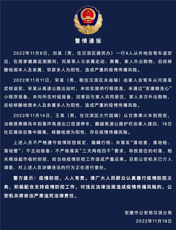 2022年11月6日,劉某(男,住漢濱區(qū)建民辦)一行4人從外地自駕車(chē)返安后,在居家健康監(jiān)測(cè)期間,劉某等人與親屬走動(dòng)、聚餐,家人外出購(gòu)物,后經(jīng)核酸檢測(cè)本人及親屬、鄰居多人為陽(yáng)性,造成嚴(yán)重的疫情傳播風(fēng)險(xiǎn)。
