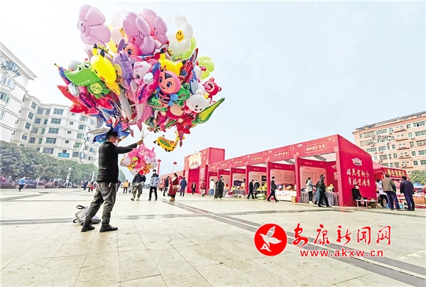 ④1月11日,“瑞兔賀新春·幸福紫陽年”年貨節(jié)開幕,一名商販舉著氣球前來“趕節(jié)”。