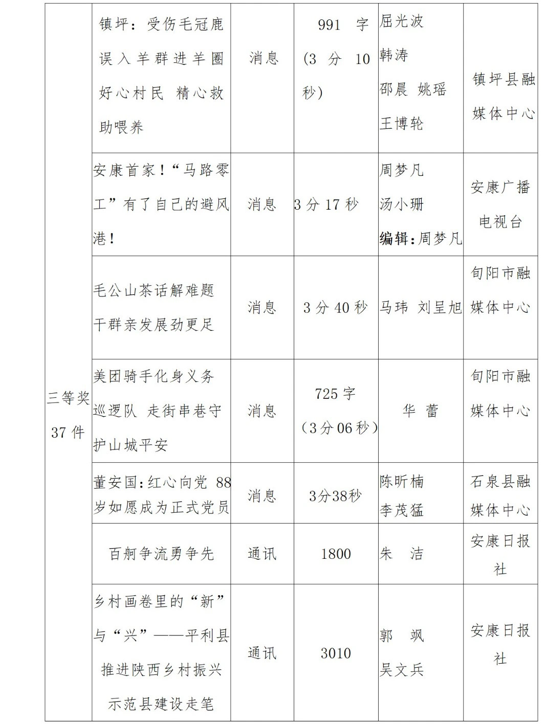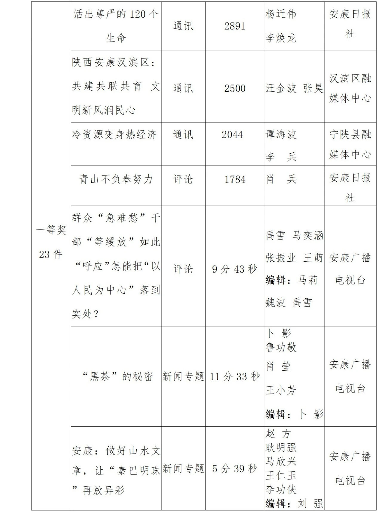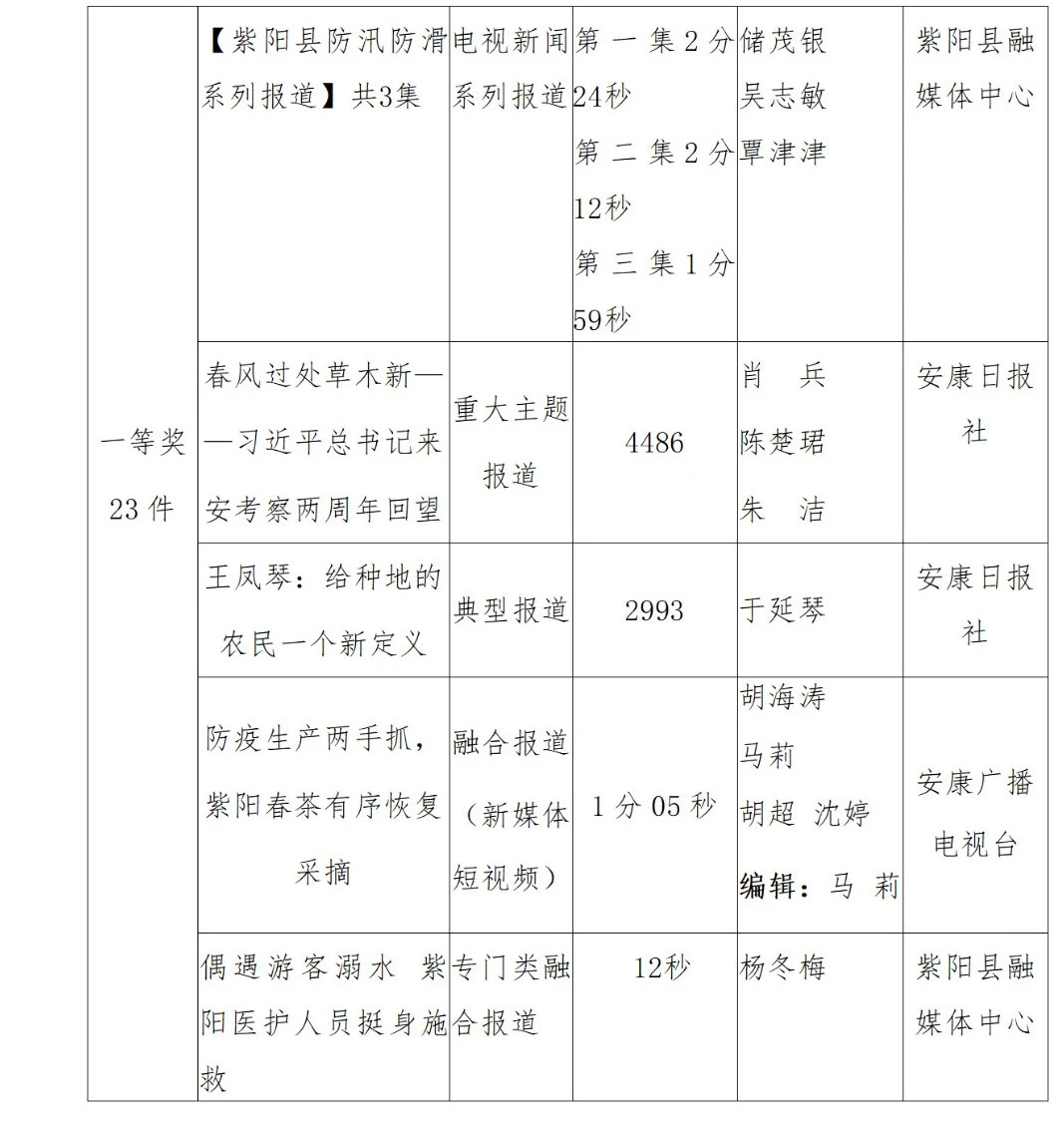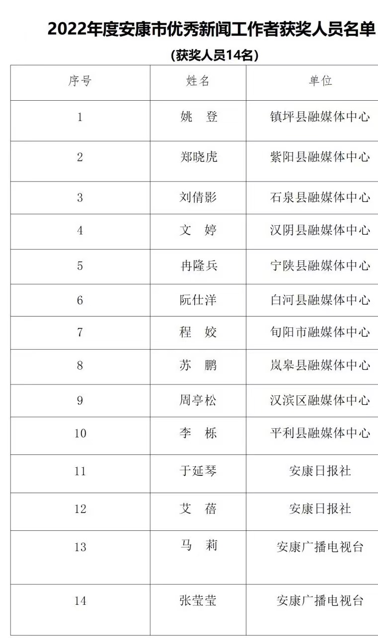 2022年度安康新聞獎(jiǎng)評(píng)審工作在中共安康市委宣傳部的指導(dǎo)下,由市記協(xié)具體組織實(shí)施,經(jīng)過各申報(bào)單位推薦、初審,市記協(xié)復(fù)審并組織專家定評(píng),評(píng)選出擬獲安康新聞獎(jiǎng)作品96件,其中一等獎(jiǎng)23件、二等獎(jiǎng)36件、三等獎(jiǎng)37件。擬授予姚登等14名同志“安康市優(yōu)秀新聞工作者”榮譽(yù)稱號(hào)。