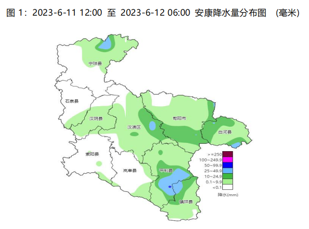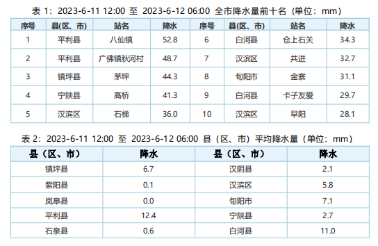 2023年6月11日下午至夜間我市大部出現(xiàn)雷陣雨天氣,其中,白河(卡子鎮(zhèn))、旬陽(關(guān)口鎮(zhèn)、棕溪鎮(zhèn)、神河鎮(zhèn)、銅錢關(guān)鎮(zhèn))、平利(廣佛鎮(zhèn))、漢陰(澗池鎮(zhèn))的部分地方出現(xiàn)了冰雹。據(jù)統(tǒng)計,2023年6月11日12時至6月12日06時安康市平均雨量為4.6毫米,其中單站雨量最大為平利八仙氣象監(jiān)測站52.8毫米,縣市平均雨量最大為平利縣12.4毫米,最大小時雨強出現(xiàn)在平利廣佛鎮(zhèn)秋河村氣象監(jiān)測站43.4毫米(6月11日17時至18時),共有154個氣象監(jiān)測站出現(xiàn)了降雨(大于0.1毫米),10毫米以上有50站,25毫米以上有14站,50毫米以上有1站。安康氣象監(jiān)測站4.3毫米。
