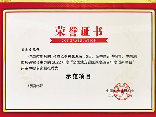 7月9日,全國(guó)地市媒體全媒體傳播體系建設(shè)推進(jìn)大會(huì)在內(nèi)蒙古烏蘭浩特市舉行。會(huì)上,對(duì)第二屆全國(guó)地方黨媒融合發(fā)展創(chuàng)新項(xiàng)目進(jìn)行了表彰,安康日?qǐng)?bào)社的《傳媒文創(chuàng)孵化基地》獲“示范項(xiàng)目”大獎(jiǎng),此獎(jiǎng)項(xiàng)陜西共兩家媒體通過(guò)評(píng)審獲獎(jiǎng)。