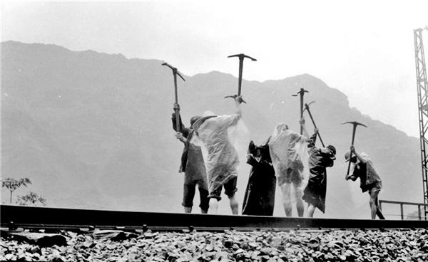 這里在大巴山深處,找不到三尺平地,無(wú)法安置站臺(tái),鐵道兵就把站臺(tái)修在橋面上。車站值班室是間磚房,一張桌子,兩張椅子,兩個(gè)值班員,一正一副。充當(dāng)站臺(tái)的橋面上鋪了三股鋼軌,一股供臨時(shí)停車用,另兩股通往山外。站臺(tái)對(duì)面是山,筆陡如削,巖石如鐵,透溢著拒人千里的冷色。