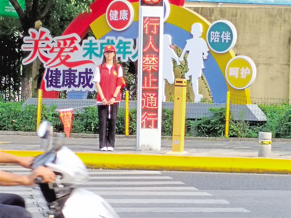 大學(xué)生志愿者劉沁怡在交通路口開(kāi)展“文明交通”志愿服務(wù)。