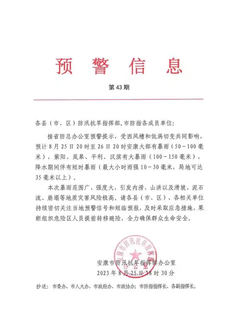 8月25日18時(shí)30分,市防汛抗旱指揮部發(fā)布預(yù)警信息:受西風(fēng)槽和低渦切變共同影響,預(yù)計(jì)8月25日20時(shí)至26日20時(shí)安康大部有暴雨(50—100毫米),紫陽(yáng)、嵐皋、平利、漢濱有大暴雨(100~150毫米),降水期間伴有短時(shí)暴雨(最大小時(shí)雨強(qiáng)10—30毫米,局地可達(dá)35毫米以上)。