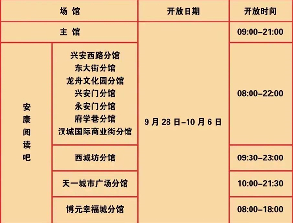 中秋、國(guó)慶期間,我市持續(xù)陰雨天氣,為加大文旅惠民力度,豐富文旅服務(wù)供給,提升文旅服務(wù)質(zhì)量,使廣大市民和游客度過一個(gè)安定、祥和、愉快的假期。安康市中心城區(qū)各文博場(chǎng)館10月1日至10月6日將適當(dāng)延長(zhǎng)場(chǎng)館開放時(shí)間。安康博物館、安康市群眾藝術(shù)館、安康市藏一角博物館開放時(shí)間延長(zhǎng)至晚19:00。安康市圖書館、安康美術(shù)館開放時(shí)間延長(zhǎng)至晚21:00。