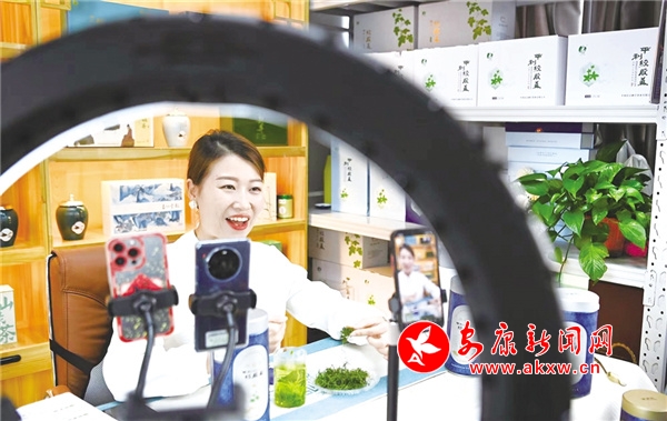 “平利漫山遍野都有絞股藍,絞股藍有‘東方神草’之稱,含有豐富的皂苷、黃酮、多糖類化合物,富有鋅、硒等多種微量元素,對人體有諸多好處。”11月5日,在第六屆中國進出口博覽會陜西館,平利縣富硒堂茶業(yè)有限公司負責人王秀梅向客商推薦介紹平利絞股藍。與此同時,在位于平利縣數字經濟產業(yè)園里的公司直播間,員工成云正在進行著絞股藍產品的直播售賣。