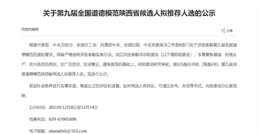 根據(jù)中宣部、中央文明辦、全國(guó)總工會(huì)、共青團(tuán)中央、全國(guó)婦聯(lián)、中央軍委政治工作部6部門(mén)關(guān)于評(píng)選表彰第九屆全國(guó)道德模范的通知要求,我省嚴(yán)格按照評(píng)選表彰實(shí)施辦法,成立評(píng)選表彰活動(dòng)組委會(huì)(以下簡(jiǎn)稱組委會(huì)),本著聚焦基層、標(biāo)準(zhǔn)從嚴(yán)、優(yōu)中選優(yōu)的原則,在廣泛發(fā)動(dòng)、征求意見(jiàn)、逐級(jí)推薦的基礎(chǔ)上,經(jīng)組委會(huì)研究審核,提出5類(lèi)共10名(每類(lèi)2名)第九屆全國(guó)道德模范陜西省候選人擬推薦人選,現(xiàn)進(jìn)行公示。