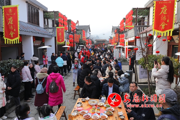 走進石泉縣中壩作坊小鎮(zhèn),大紅燈籠高高掛,山貨特產(chǎn)來云集,洋溢著喜慶的過年氛圍。隨著打連錢、舞彩獅、抬花轎、采蓮船等民俗展演活動開始,中壩文化休閑廣場上人山人海,熱鬧非凡。陜北民歌手、安康小場子、漢調(diào)二黃等非遺傳承“文化走親”活動,更是給廣大游客和城鄉(xiāng)群眾帶來豐富多彩的文化體驗。“上菜嘍——”隨著一聲長長的吆喝聲,最具年俗特色的庖湯宴開始了,方桌板凳擺長街,用剛剛宰殺的新鮮豬肉烹飪出的各色陜南傳統(tǒng)美食,吸引了眾多鄉(xiāng)親和游客來品嘗。