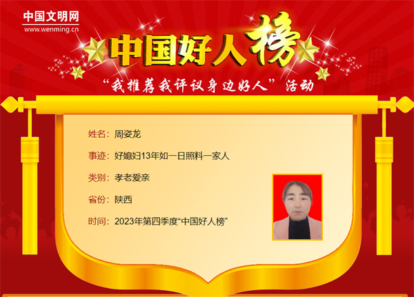 周姿龍,女,1969年8月生,陜西省安康市漢濱區(qū)晏壩鎮(zhèn)泰山廟村村民。丈夫車禍摔跤致癱在家后,周姿龍堅強地挑起了生活的重?fù)?dān)。13年來,她護理身體癱瘓的丈夫、照顧精神障礙的姑姐、照料年事已高的公公,用自己的堅定和責(zé)任,為家人撐起了一片愛的天空。