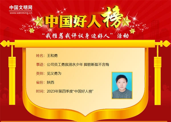 王和勇,男,1987年8月生,陜西省水務(wù)公司職工。在少年溺水的危機時刻,王和勇忘記自己“準(zhǔn)爸爸”的身份,毫不猶豫跳進水流湍急的河里奮勇施救。王和勇曾獲“陜西好人”榮譽。