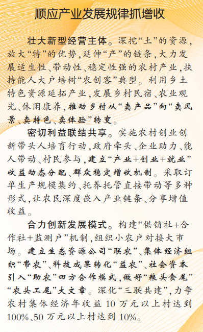 把握市場運(yùn)行規(guī)律抓改革。用活土地要素。統(tǒng)籌農(nóng)村“三塊地”改革,扎實(shí)推進(jìn)承包地延期,在農(nóng)民自愿前提下實(shí)施農(nóng)田集中連片整理。加強(qiáng)農(nóng)村宅基地管理,嚴(yán)格落實(shí)“一戶一宅”政策。探索集體經(jīng)營性建設(shè)用地“同等入市、同權(quán)同價(jià)”,兼顧國家、農(nóng)村集體經(jīng)濟(jì)組織和農(nóng)民利益。配置流動(dòng)要素。順應(yīng)人口流動(dòng)和產(chǎn)業(yè)發(fā)展趨勢,提高城鄉(xiāng)要素雙向協(xié)同效率,推動(dòng)要素市場化改革。促進(jìn)有能力在城鎮(zhèn)穩(wěn)定就業(yè)和生活的農(nóng)業(yè)轉(zhuǎn)移人口有序市民化,落實(shí)常住地提供基本服務(wù)制度。集成治理要素。深化“五治融合”創(chuàng)新舉措,實(shí)施農(nóng)村基層治理提升工程。