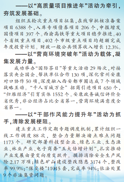 社會(huì)治理堅(jiān)實(shí)穩(wěn)固。安全監(jiān)管有力。未發(fā)生重大及以上生產(chǎn)安全事故。組建819支應(yīng)急救援隊(duì)伍,落實(shí)2966處地質(zhì)災(zāi)害隱患監(jiān)測預(yù)警,成功應(yīng)對17輪次強(qiáng)降雨。社會(huì)穩(wěn)定有序。信訪法治化試點(diǎn)全省先行,信訪工作綜合考核名列全省第一。創(chuàng)新舉措有效。村財(cái)審計(jì)監(jiān)督在全國成為經(jīng)驗(yàn)。社會(huì)治理“安康模式”全省推廣,平安建設(shè)滿意度全省第一,獲評“全國市域社會(huì)治理現(xiàn)代化試點(diǎn)合格城市”。