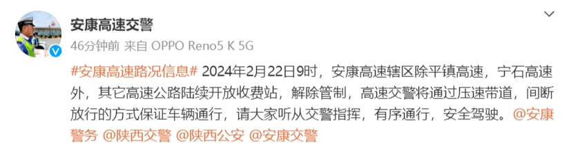 2月22日9時(shí),安康高速交警發(fā)布通知:安康高速轄區(qū)除平鎮(zhèn)高速,寧石高速外,其它高速公路陸續(xù)開放收費(fèi)站,解除管制,高速交警將通過壓速帶道,間斷放行的方式保證車輛通行。LPW安康新聞網(wǎng)
