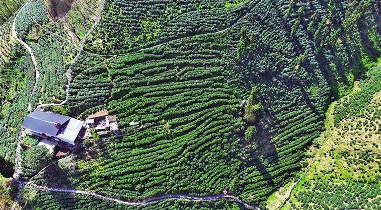 3月27日航拍的安康市紫陽縣煥古鎮(zhèn)茶園。 陜西日?qǐng)?bào)記者 田若楠攝