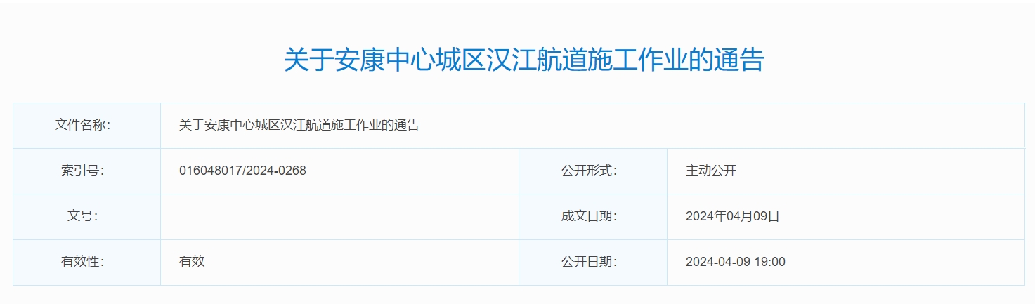 關于安康中心城區(qū)漢江航道施工作業(yè)的通告