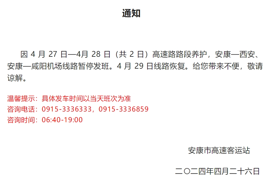 本周末 安康至西安、咸陽機場高速客運暫停發(fā)班