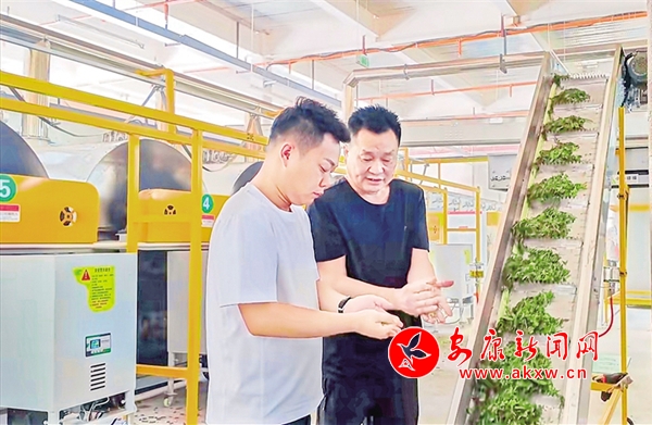 井泉茶業(yè)公司在廣佛鎮(zhèn)剛剛建成的初制茶加工廠一片忙碌,正在運轉(zhuǎn)的機械上,一片片茶鮮葉隨著履帶高低起伏,空氣中彌漫著濃郁的茶香,經(jīng)過殺青、揉捻、干燥等工序后,收購來的茶青就蛻變成了色綠、香郁、味醇的初制干毛茶。