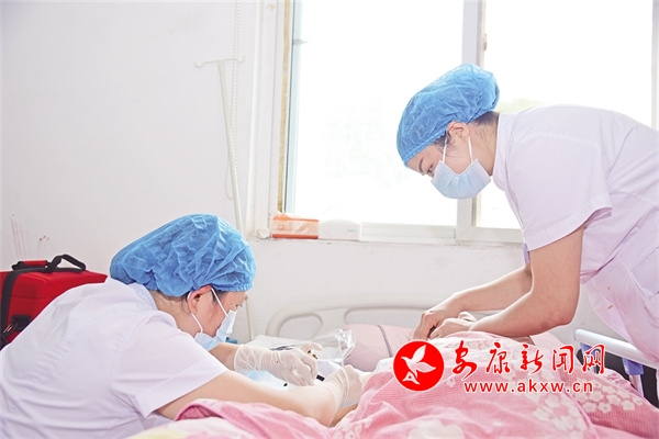 十幾分鐘后,白河縣人民醫(yī)院PICC專科護(hù)士袁茜和杜曉雨帶著醫(yī)藥箱趕到城關(guān)鎮(zhèn)廣興金座8號樓3層樊阿姨家里。