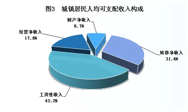 全市城鎮(zhèn)居民人均可支配收入33639元,比上年增加1663元,增長(zhǎng)5.2%。其中,工資性收入14181元,增長(zhǎng)5.0%,占可支配收入的比重為42.2%;經(jīng)營(yíng)凈收入5995元,增長(zhǎng)4.7%,占比17.8%;財(cái)產(chǎn)凈收入2910元,增長(zhǎng)5.8%,占比8.7%;轉(zhuǎn)移凈收入10553元,增長(zhǎng)5.6%,占比31.4%。