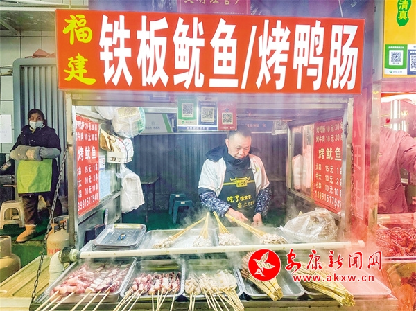 對此,在距離不遠的金州路雙堤巷擺攤多年的福建人嚴(yán)國強有著更深的感觸。“我來安康有20多年了,主要賣烤魷魚,租個鋪子不劃算,就這種小車又方便成本也低。最開始我在市中心廣場附近擺攤,那時候流動性比較大,顧客也不太放心在我們這種小攤上消費。這幾年政府倡導(dǎo)‘夜經(jīng)濟’,我就干脆搬過來了,今年給我們統(tǒng)一辦理了營業(yè)執(zhí)照、食品攤販登記備案卡,顧客一看這些證件,消費起來更安心不說,對我們也是一種保障,能夠固定在一個地方長久地將生意做下去,水電這些也不用自己再想辦法解決,我很知足了。”