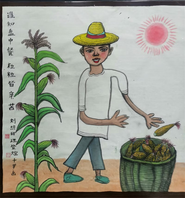 四年級的汪紫煊在參加夏令營時,在玉米田里看到一幕,深深地吸引了她,一位農(nóng)民伯伯戴著草帽在烈日下,把玉米裝進(jìn)筐里。曾經(jīng)學(xué)過的詩句在她腦海里浮現(xiàn),文字變成了立體的畫面,她為自己這幅畫起名《誰知盤中餐 粒粒皆辛苦》。汪紫煊覺得,這種吃苦耐勞的精神要發(fā)揚(yáng),更要珍惜糧食,感受糧食的來之不易。