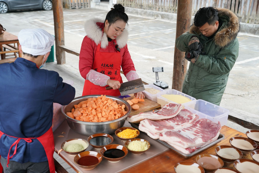 2月21日,在安康市漢濱區(qū),李花(中)在她的農(nóng)家樂院內(nèi),制作準(zhǔn)備用于網(wǎng)絡(luò)銷售的蒸碗,并拍攝短視頻。李花和丈夫從經(jīng)營農(nóng)家樂起步,后通過短視頻和直播等方式,在……