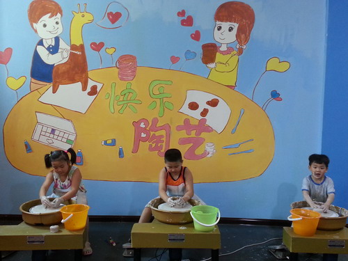 孩子們興致勃勃,當(dāng)看到展柜上擺放著各式玲瑯滿目的陶藝作品時(shí),無(wú)不欣喜萬(wàn)分,贊不絕口。在認(rèn)真聽(tīng)完陶藝?yán)蠋煹慕虒?dǎo)后便都迫不及待地躍躍欲試,紛紛卷起衣袖,摩拳擦掌,奔向各自的工作崗位,有的拉坯,有的塑泥,有的彩繪,忙的不亦樂(lè)乎。揉、挫、捏、摔,不一會(huì)兒,便做出了各種千奇百怪的造型,盡管這些作品還算不上精美,但卻表現(xiàn)出孩子們極大的熱情和想象力。來(lái)自安師附小的張同學(xué)一邊捏著泥巴,一邊說(shuō)道:“等我做好了,就拿回去送給爸爸媽媽,讓他們看看我的杰作。”而來(lái)自安康中學(xué)的周同學(xué)則表示:“陶藝活動(dòng)很有意思,可以隨心所欲,無(wú)拘無(wú)束。”當(dāng)一件件充滿稚氣和夢(mèng)想的作品成功出爐時(shí),我們和孩子們一樣心中充滿了自豪和成就感。每次活動(dòng)結(jié)束時(shí),不少學(xué)生仍意猶未盡,表示希望能在節(jié)假日和父母一起來(lái)陶藝館度過(guò)美好的一天。
