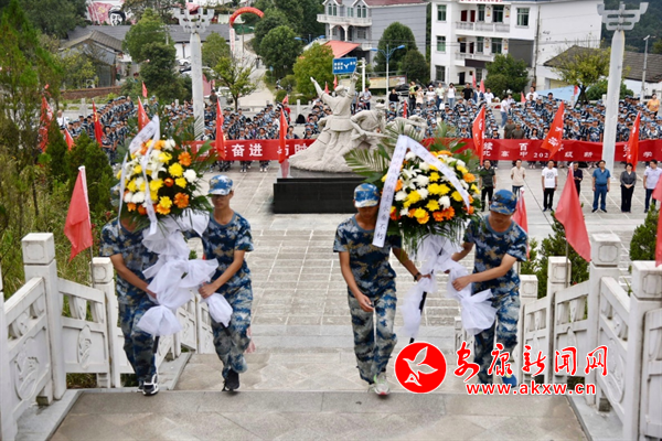 在戰(zhàn)斗紀(jì)念碑前,大家集體默哀,并向烈士敬獻(xiàn)花籃。講解員生動講述著牛蹄嶺的戰(zhàn)斗事跡,在場的每一位仿佛回到了那個戰(zhàn)火紛飛的年代,真切感受到革命先烈不怕犧牲、甘于奉獻(xiàn)的紅色精神。隨后,校黨總支副書記徐信濤作了題為“賡續(xù)紅色基因,肩負(fù)祖國未來”的報告。徐書記從18歲烈士陳祥榕以身護(hù)國講到東京奧運會上14歲少女全紅嬋為國爭光,再到習(xí)近平總書記來陜考察對青年學(xué)生的深切寄語,希望同學(xué)們在高中新起點上,扣好人生的“第一粒扣子”,立大志,明大德,成大才,擔(dān)大任,以自己的優(yōu)異成績告慰革命先烈,以自己的優(yōu)異表現(xiàn)實現(xiàn)強(qiáng)國夢想。接著,在高一年級郭紅梅老師的帶領(lǐng)下,全體學(xué)生面對紀(jì)念碑莊嚴(yán)宣誓,錚錚誓言,清澈響亮,無不透露出新時代少年報效祖國的堅定信心。