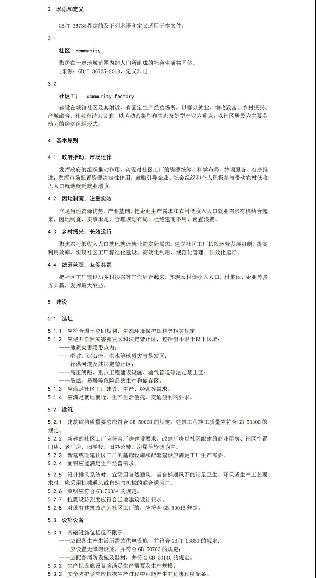 2020年6月,安康市人社局申請陜西省地方標準的立項,同年7月,陜西省市場監(jiān)督管理局批準同意該標準制定。安康市人社局聯合安康市市場監(jiān)督管理局共同成立標準起草組,形成標準草案。歷時兩年時間在全省范圍內實地調研,通過書面征求意見,反復修訂完善,專家評議審查等程序,最終形成報批稿。該標準分別從范圍、規(guī)范性引用文件、術語與定義、基本原則、建設、管理、評價與改進等七方面對社區(qū)工廠的建設與管理予以規(guī)范明確。