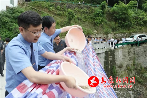6月5日,在剛剛過(guò)去的第51個(gè)世界環(huán)境日,安康鐵檢院、安鐵法院、安康市農(nóng)業(yè)農(nóng)村局等單位在紫陽(yáng)聯(lián)合開(kāi)展增殖放流活動(dòng),用三名被告繳納的野生動(dòng)物資源損失費(fèi)購(gòu)買錢魚(yú)魚(yú)苗10000余尾,投放在案發(fā)地水域,及時(shí)修復(fù)因犯罪行為而受損的任河國(guó)家級(jí)保護(hù)區(qū)的生態(tài)環(huán)境。