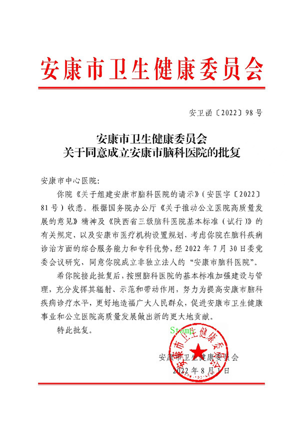 8月10日,市衛(wèi)健委正式批準成立“安康市腦科醫(yī)院”,開啟了安康市腦病科領域發(fā)展新篇章。