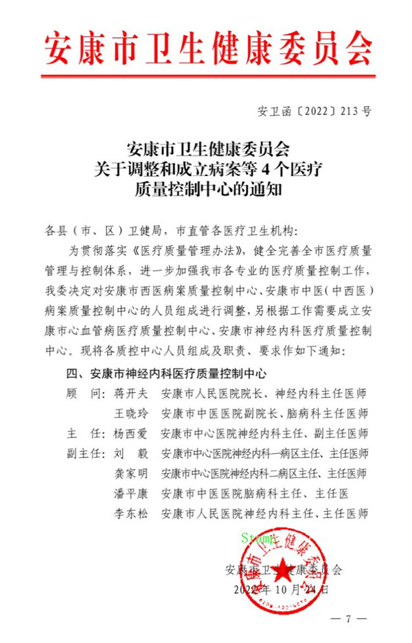 10月24日,市衛(wèi)健委成立安康市神經內科醫(yī)療質量控制中心,掛靠腦科醫(yī)院。楊西愛為中心主任。