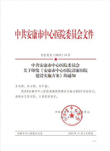 記者:2022年11月2日,安康市中心醫(yī)院黨委印發(fā)了《安康市中心醫(yī)院清廉醫(yī)院建設(shè)實施方案》。今后一個時期,醫(yī)院如何圍繞方案,全面推進(jìn)清廉醫(yī)院建設(shè),切實把清廉要素融入全方位推動醫(yī)院高質(zhì)量發(fā)展全過程各方面,營造風(fēng)清氣正的政治生態(tài)和良好發(fā)展環(huán)境?