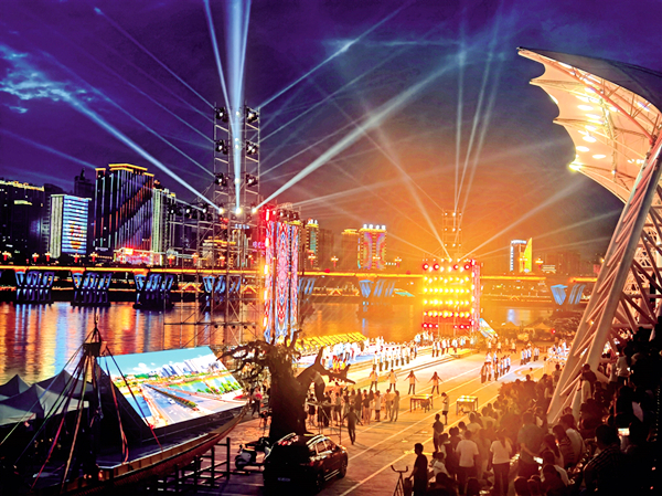 為保證第二十三屆中國(guó)安康漢江龍舟節(jié)舞臺(tái)夜間燈光照明及燈光秀,6月19日,燈光師正在加緊調(diào)試燈光。陳德模 攝hRd安康新聞網(wǎng)