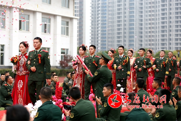 婚禮儀式現(xiàn)場,伴隨著《婚姻進(jìn)行曲》和熱烈掌聲,新娘手挽新郎依次穿過“同心門”,在戰(zhàn)友們的見證下緩緩步入幸福的舞臺(tái)。該支隊(duì)領(lǐng)導(dǎo)為12對(duì)新人證婚,新郎與新娘十指緊扣,在眾人的見證下,面對(duì)武警部隊(duì)旗許下相守終身的軍婚誓言,并互換愛情信物、互送美好祝福,新郎代表、新娘代表依次登臺(tái)發(fā)言,熱烈的掌聲久久回蕩在營區(qū)上空。